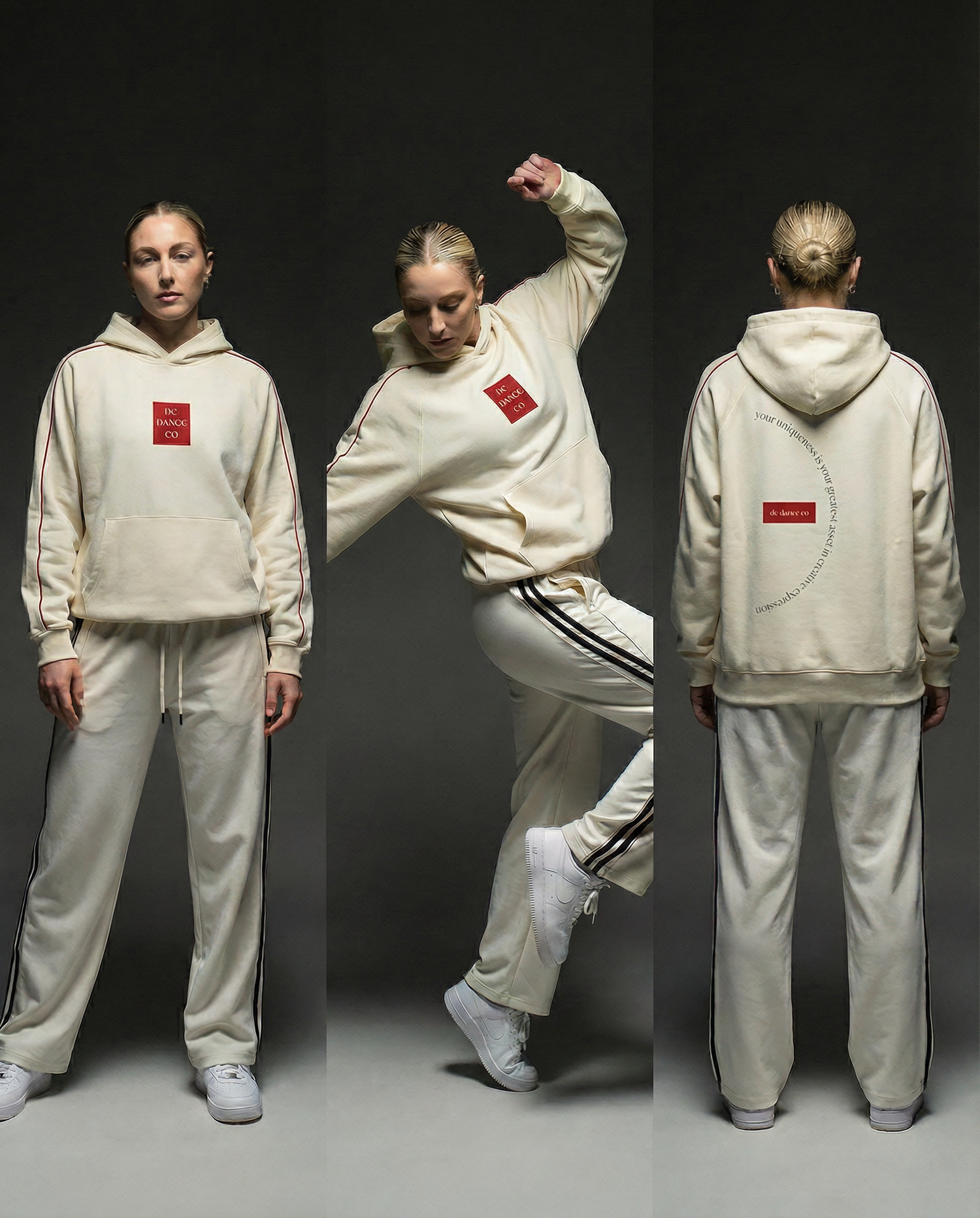 Our collection blends legacy-inspired design with a modern, art-driven aesthetic—celebrating movement, expression, and the artistry behind the craft. From striped warm-up pants and heavyweight joggers to graphic tees and statement hoodies, each piece is thoughtfully designed for comfort, versatility, and everyday creativity. Neutral tones, bold typography, and relaxed silhouettes come together to create dance essentials that feel as good in the studio as they do beyond it.