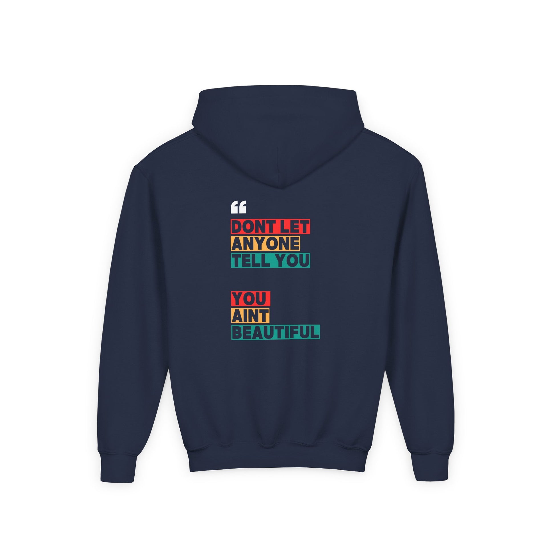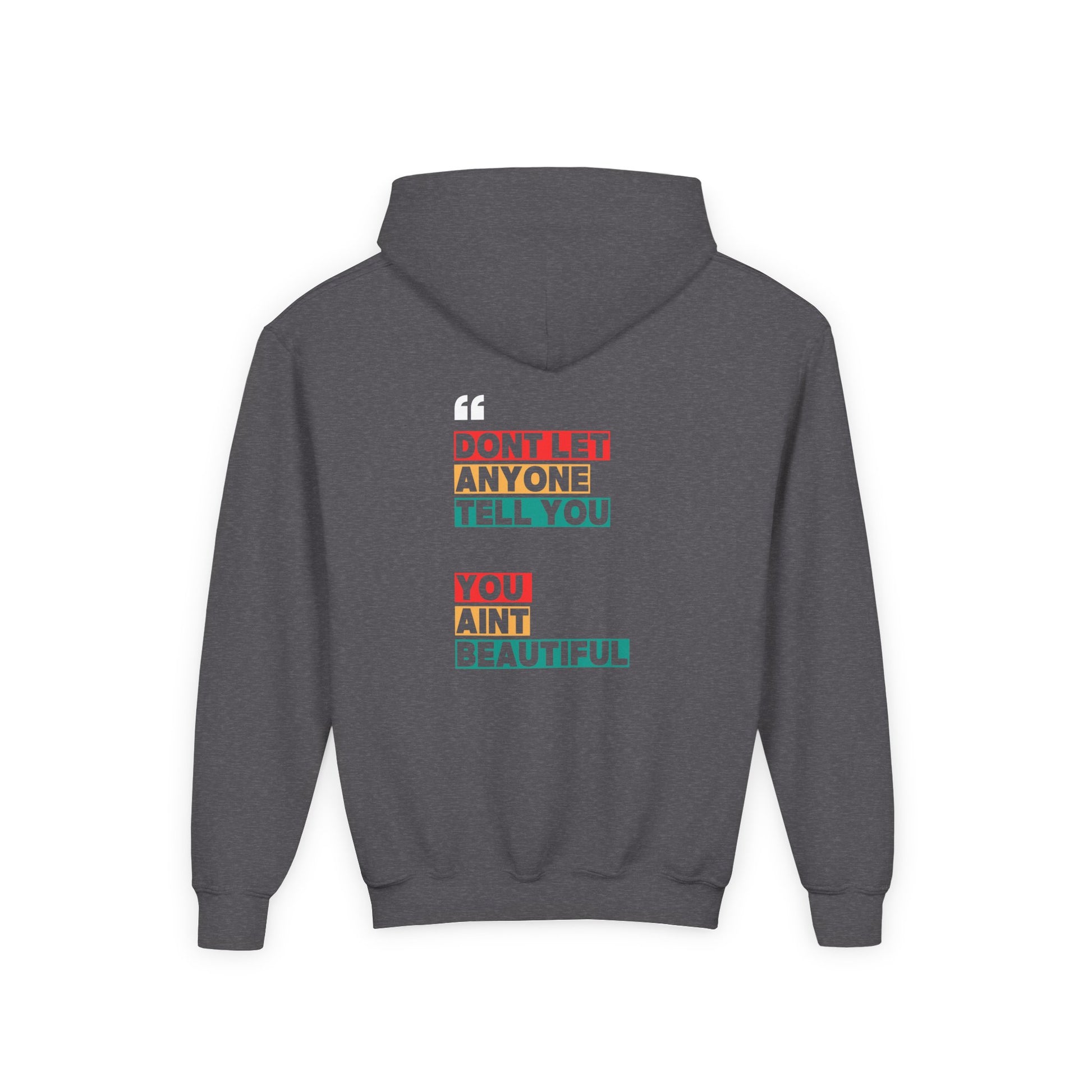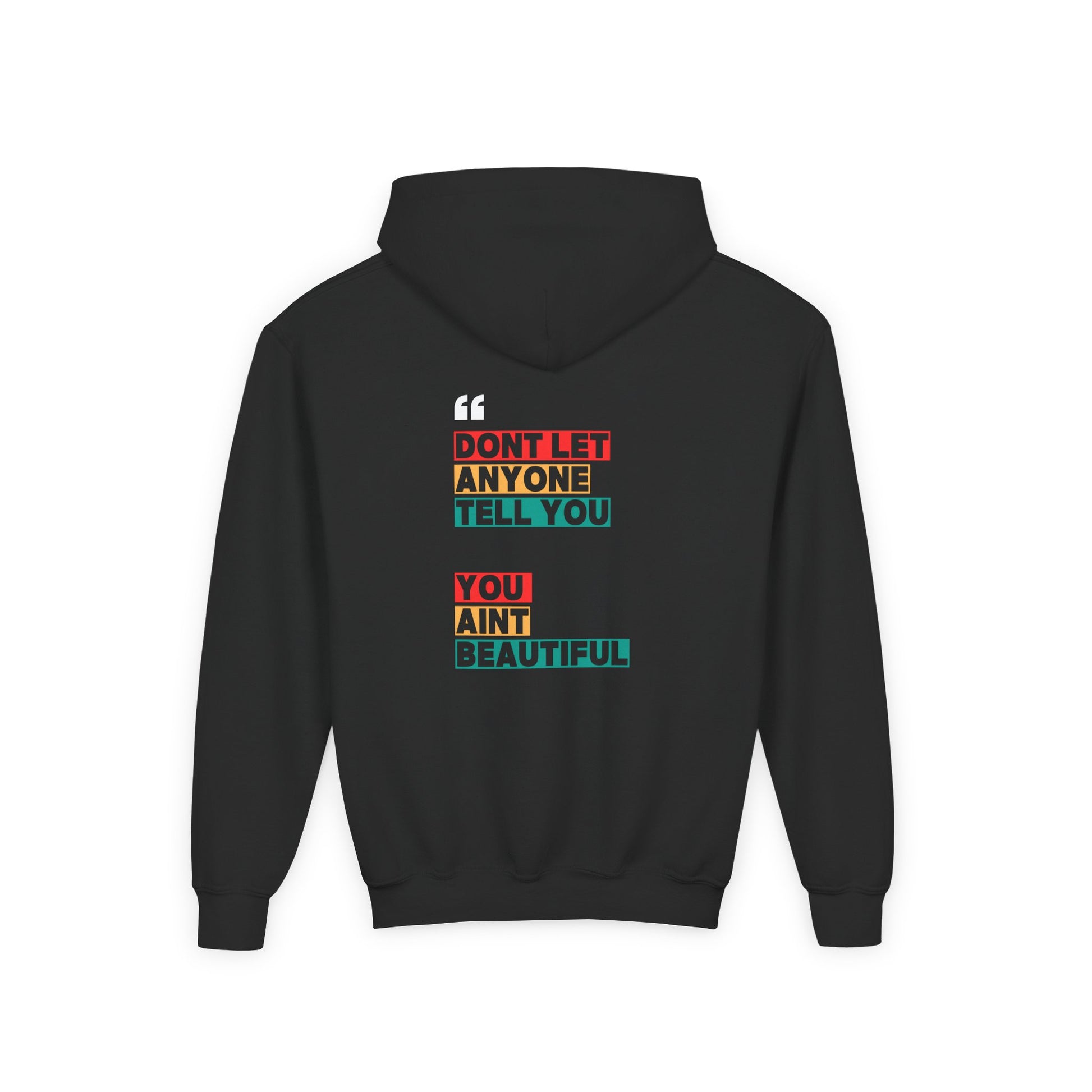 Introducing the perfect Youth Heavy Blend Hooded Sweatshirt, a cozy and stylish addition to any young person's wardrobe. This sweatshirt radiates a sense of comfort and confidence, perfect for everyday wear or special occasions. It's ideal for chilly days at school or fun family outings. The vibrant message on the back inspires self-love and positivity, making it a great gift for birthdays or back-to-school celebrations. Parents will appreciate its durability and comfort, while kids will love the fashionable design. Celebrate individuality and warmth with this must-have hoodie, suitable for both casual hangouts and holiday gatherings.