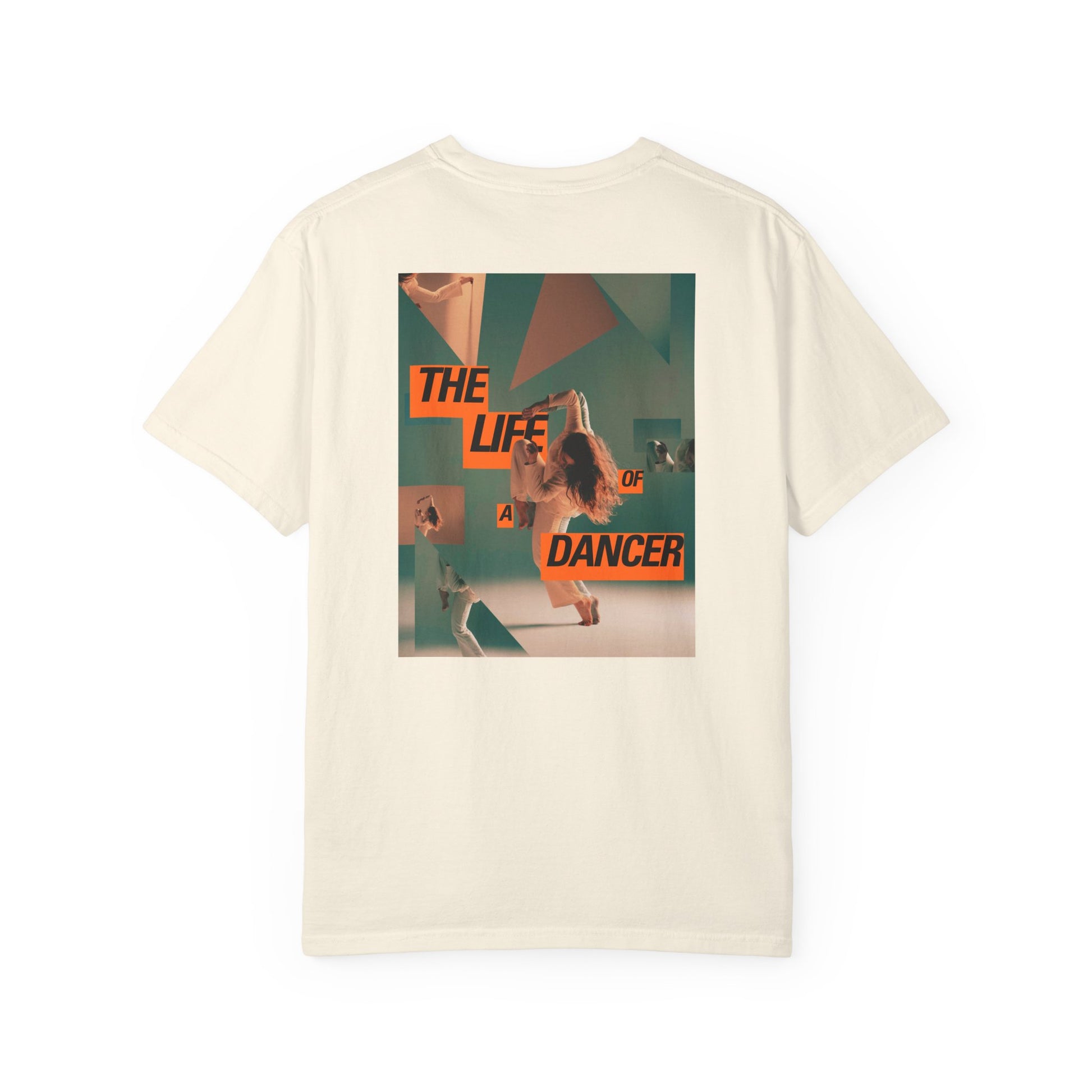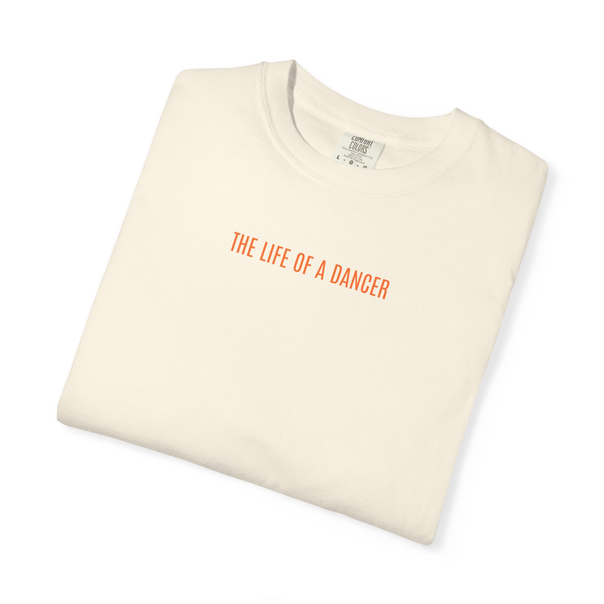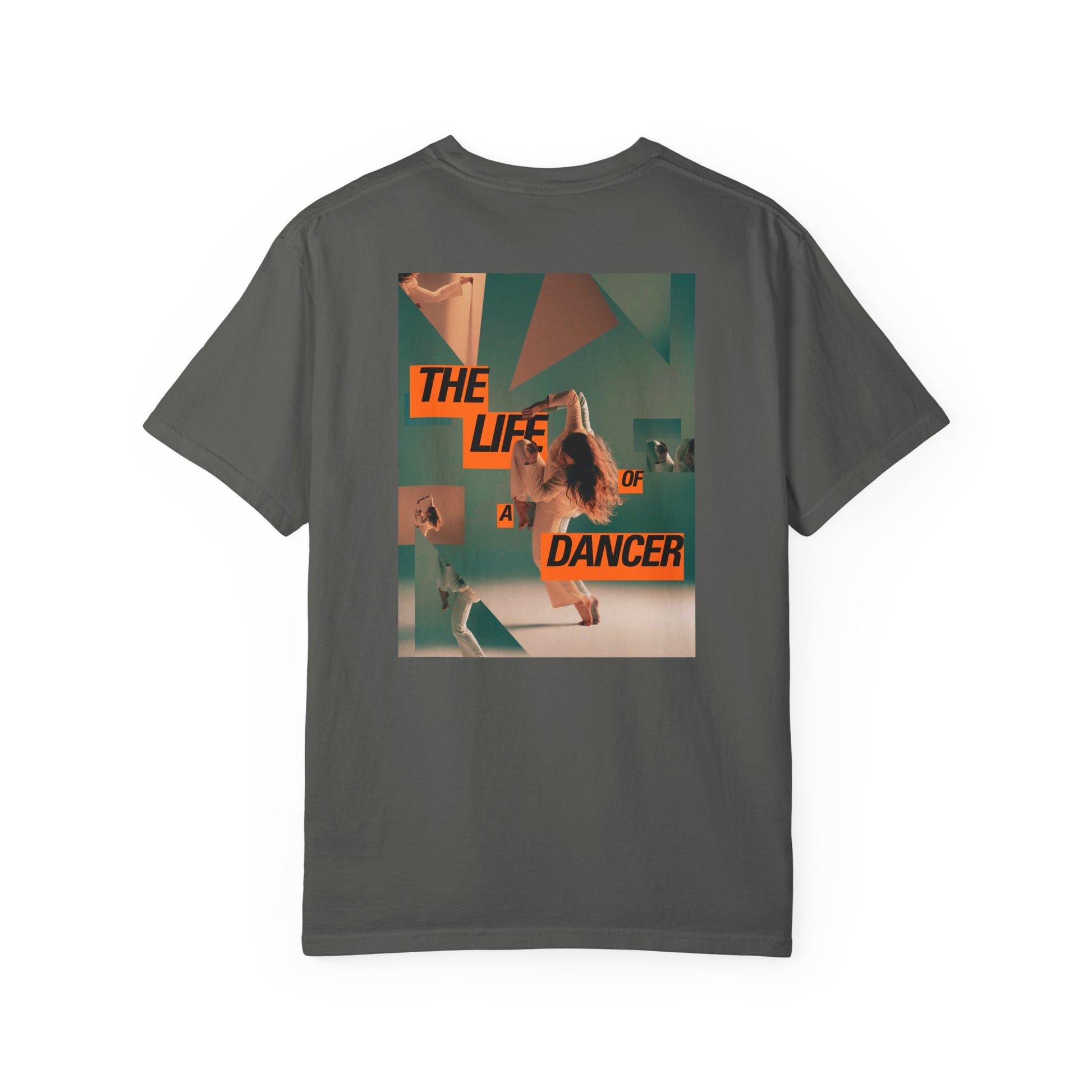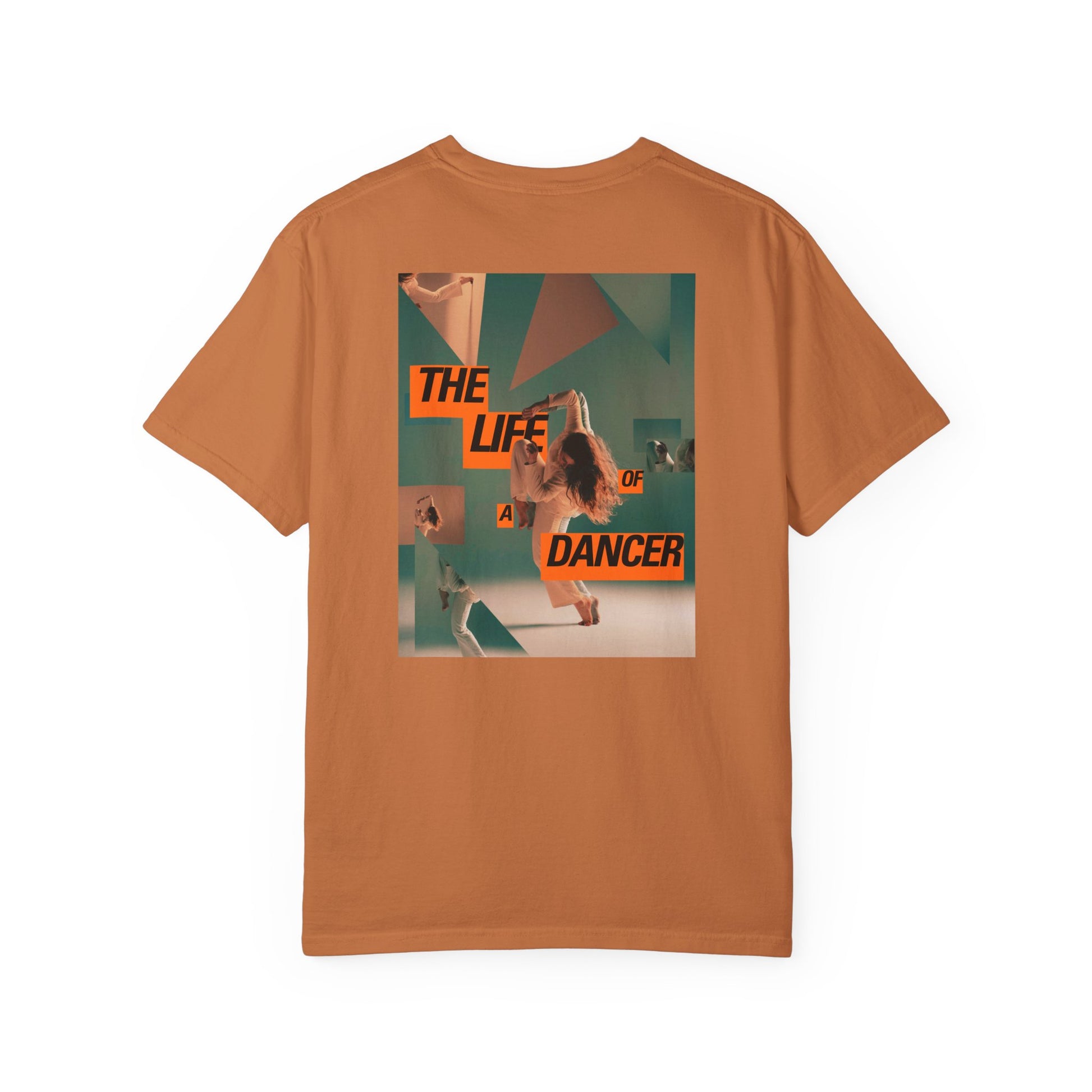 A relaxed, garment-dyed tee that feels lived-in from the first wear. Subtle front text and a bold, collage-style back graphic celebrate movement and studio life: a dancer caught mid-leap, abstract stage elements, and punchy orange type that reads “THE LIFE OF A DANCER.” Soft, medium-weight 100% ring-spun cotton drapes easily over rehearsals, coffee runs, and late-night chore sessions. The tubular knit and double-needle stitching mean the shirt holds its shape through repeat wears and washes, while the pre-shrunk fabric keeps sizing consistent. Available in many colors and sizes, this tee blends understated front detail with an expressive back that speaks to anyone who lives for practice, performance, and the quiet moments between.